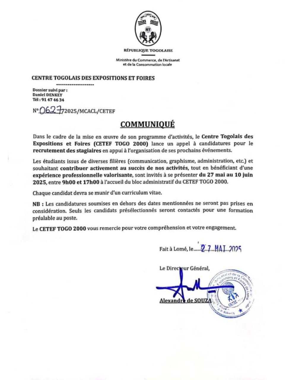 Le CETEF Togo 2000 recrute des stagiaires pour appuyer l’organisation de ses prochains événements. Dans un communiqué officiel, le Centre Togolais des Expositions et Foires lance un appel à candidatures à l’endroit des étudiants motivés, issus de diverses filières comme la communication, le graphisme ou l’administration.