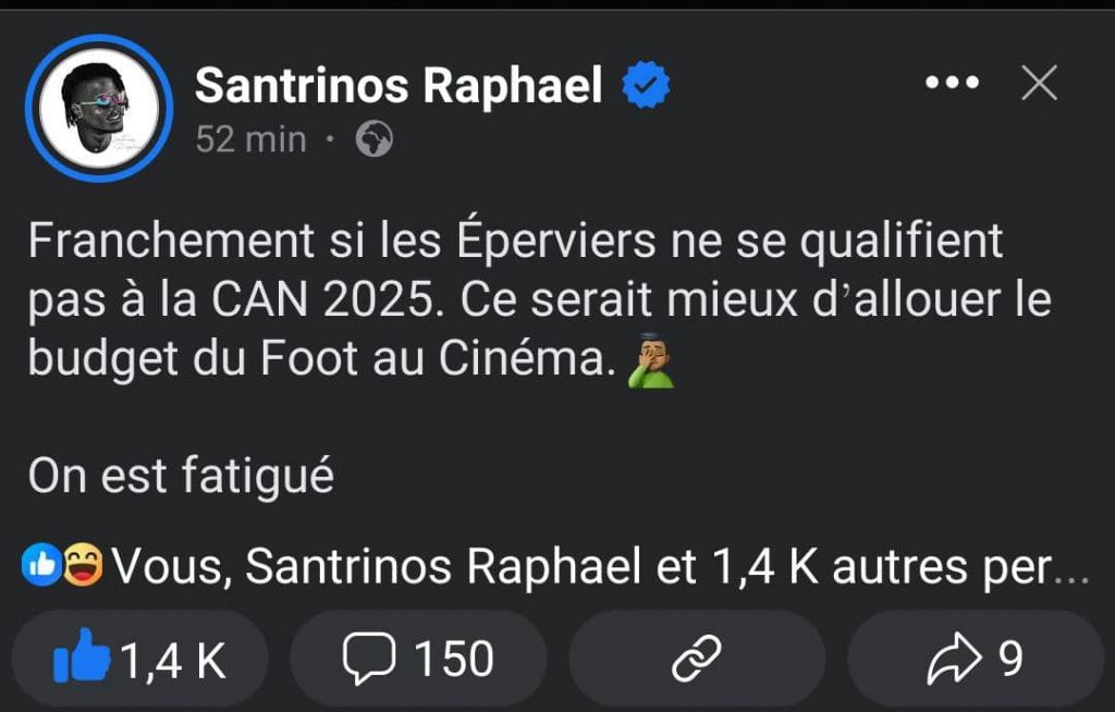 Santrinos Raphaël, célèbre artiste togolais, a exprimé son mécontentement sur Facebook. Il affirme que si le Togo échoue à se qualifier cette fois-ci, il vaudrait mieux allouer le budget du football au cinéma.